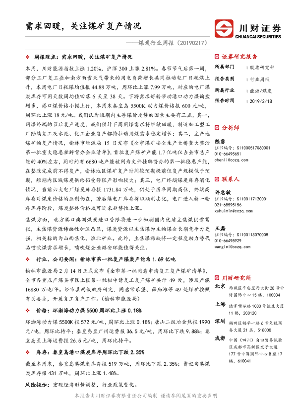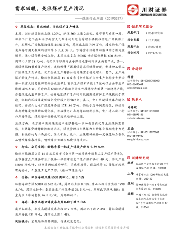 【川财证券】【20190218】煤炭行业周报:需求回暖,关注煤矿复产情况-15页