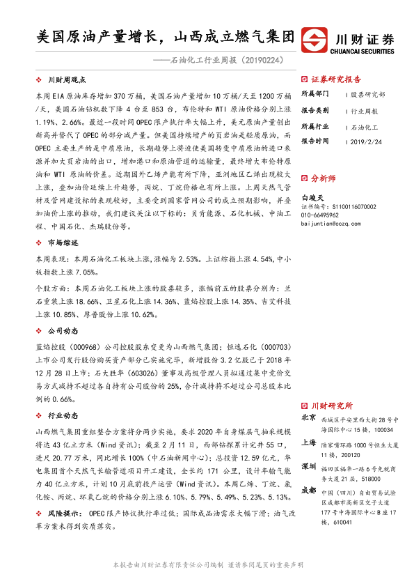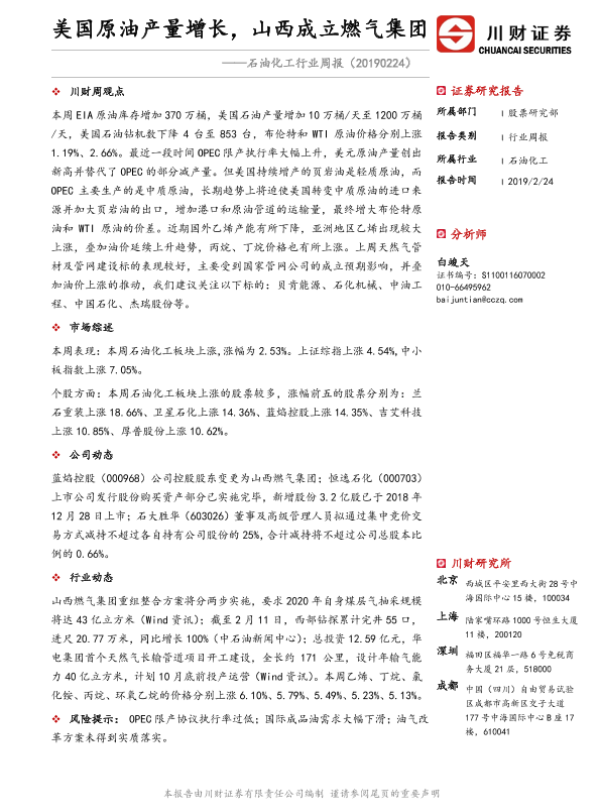 【川财证券】【20190224】石油化工行业周报:美国原油产量增长,山西成立燃气集团-11页