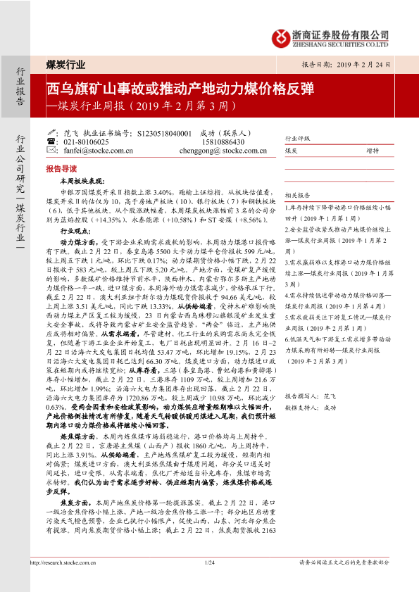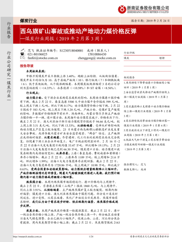 【浙商证券】【20190224】20190224-浙商证券-煤炭行业周报(2019年2月第3周):西乌旗矿山事故或推动产地动力煤价格反弹-24页