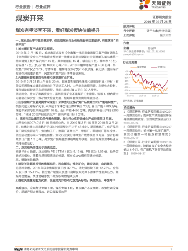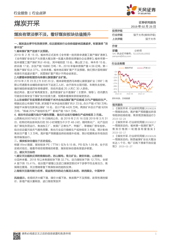 【天风证券】【20190225】20190225-天风证券-煤炭开采行业点评:煤炭有望淡季不淡,看好煤炭板块估值提升-5页