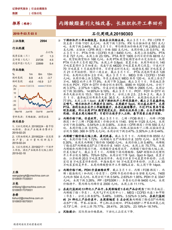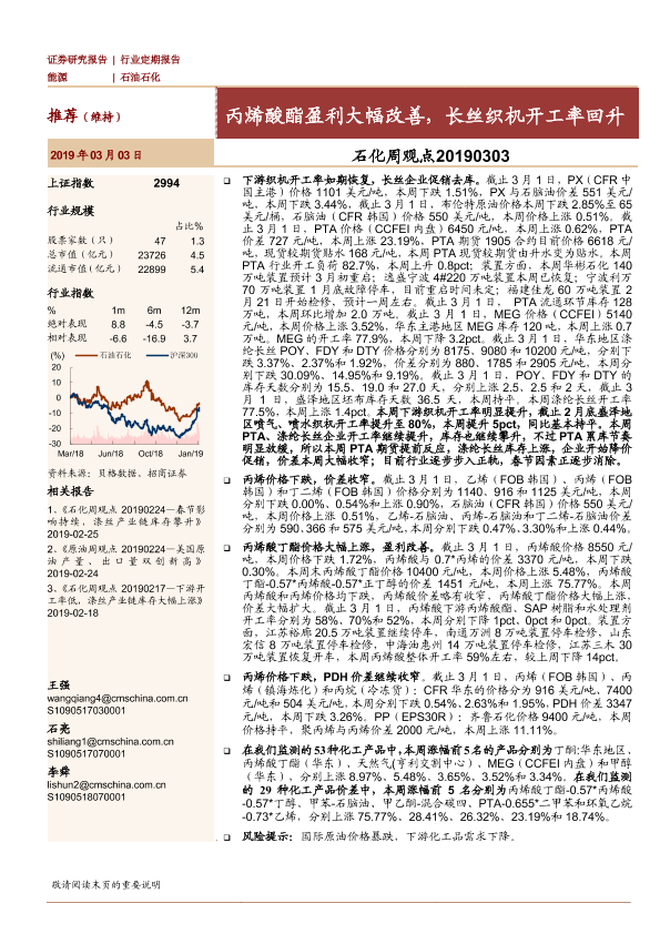 【海通证券】【20190303】石化周观点:丙烯酸酯盈利大幅改善,长丝织机开工率回升-18页