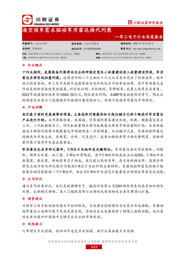 【川财证券】【20221024】军工电子行业深度报告:海空强军需求驱动军用雷达换代列装-17页