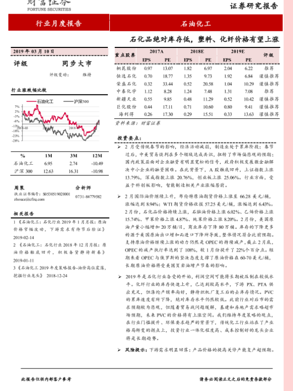 【财信证券】【20190310】石油化工行业月度报告:石化品绝对库存低,塑料、化纤价格有望上涨-10页