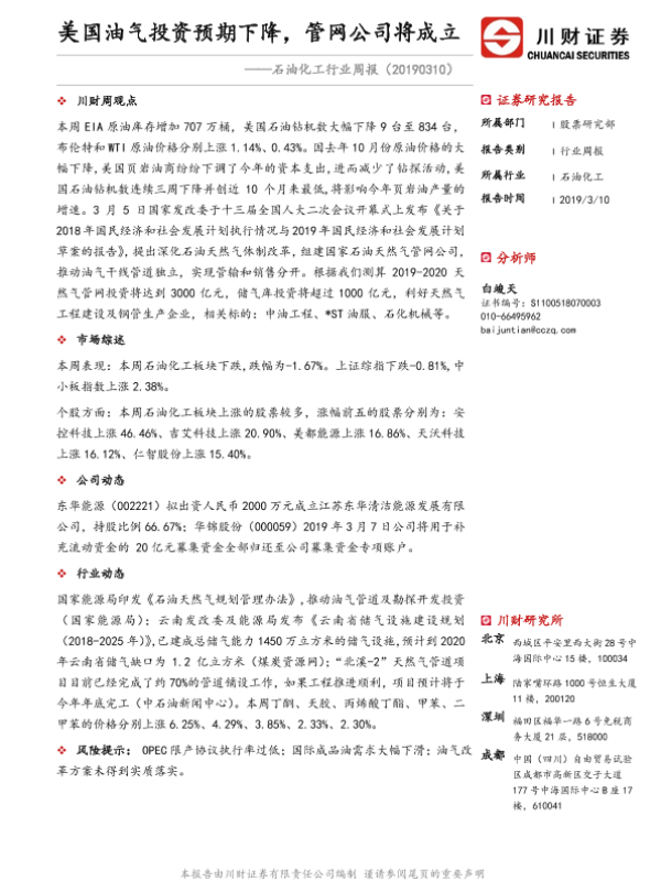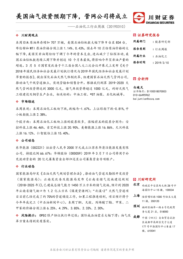 【川财证券】【20190310】石油化工行业周报:美国油气投资预期下降,管网公司将成立-12页
