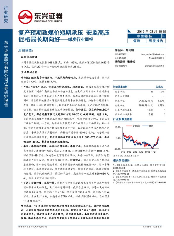 【东兴证券】【20190310】20190310-东兴证券-煤炭行业周报:复产预期致煤价短期承压 安监高压促格局长期向好-18页