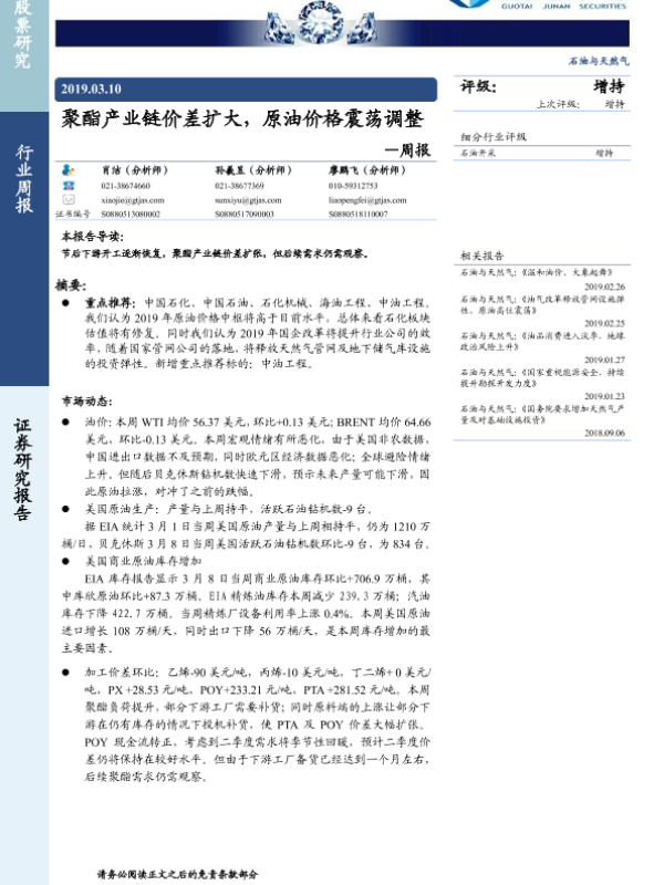 【国泰君安证券】【20190310】20190310-国泰君安-石油与天然气周报:聚酯产业链价差扩大,原油价格震荡调整-8页