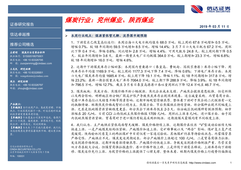 【信达证券】【20190311】煤炭行业:兖州煤业、陕西煤业-8页