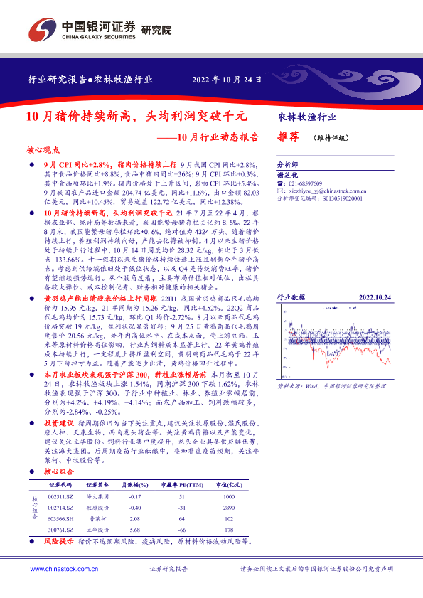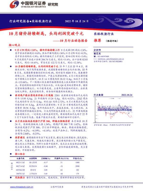 【银河证券】【20221024】农林牧渔行业10月行业动态报告:10月猪价持续新高,头均利润突破千元-20页