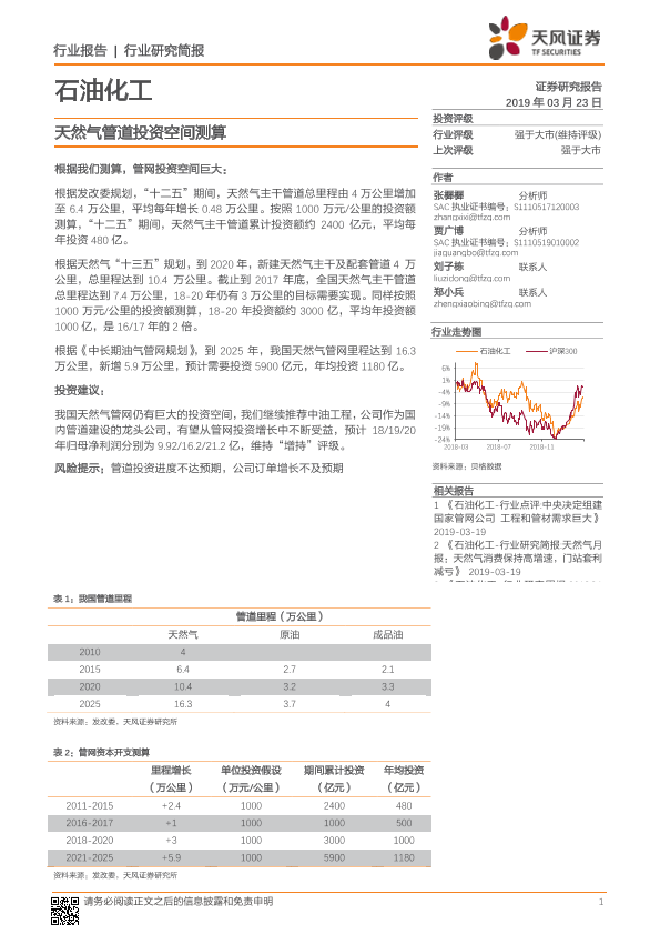 【天风证券】【20190323】石油化工行业研究简报:天然气管道投资空间测算-2页