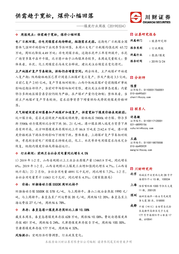 【川财证券】【20190324】20190324-川财证券-煤炭行业周报:供需趋于宽松,煤价小幅回落-14页