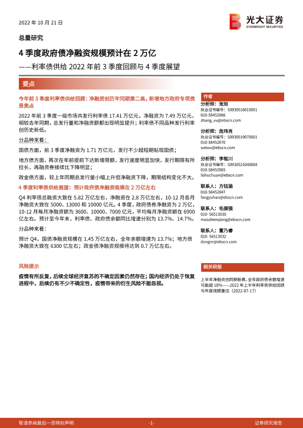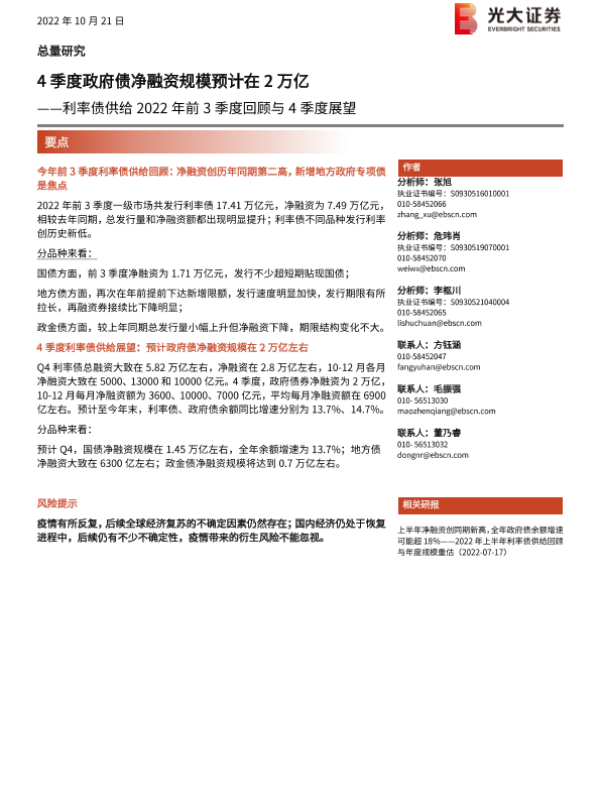 【光大证券】【20221021】利率债供给2022年前3季度回顾与4季度展望:4季度政府债净融资规模预计在2万亿-25页