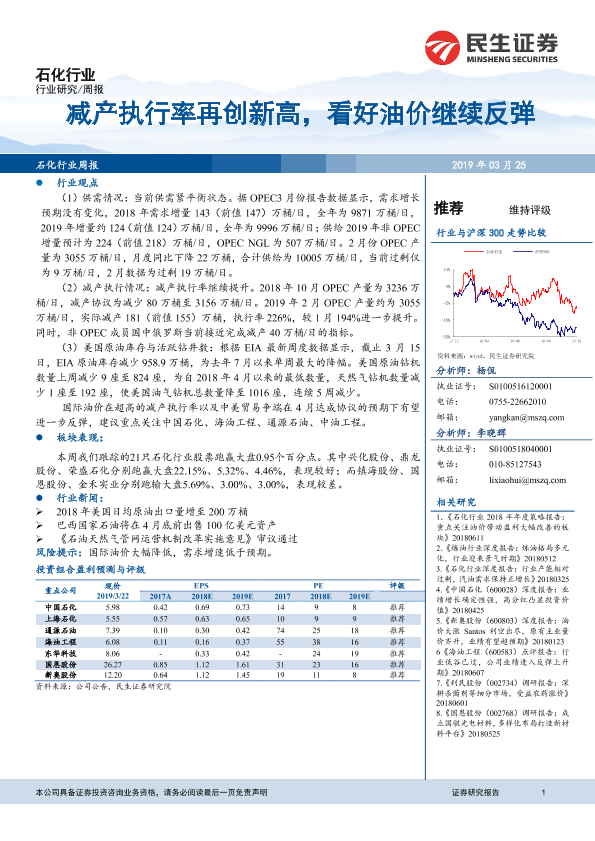 【民生证券】【20190325】20190325-民生证券-石化行业周报:减产执行率再创新高,看好油价继续反弹-15页