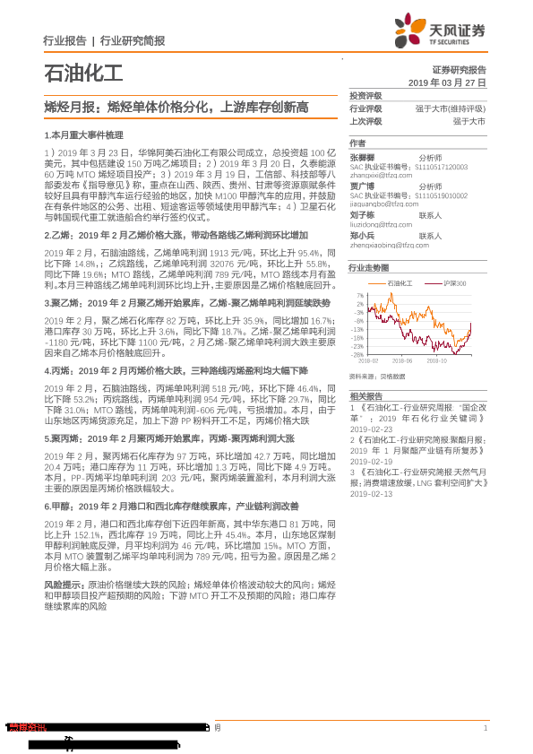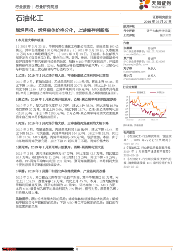 【天风证券】【20190327】20190327-天风证券-石油化工:烯烃月报:烯烃单体价格分化,上游库存创新高-9页