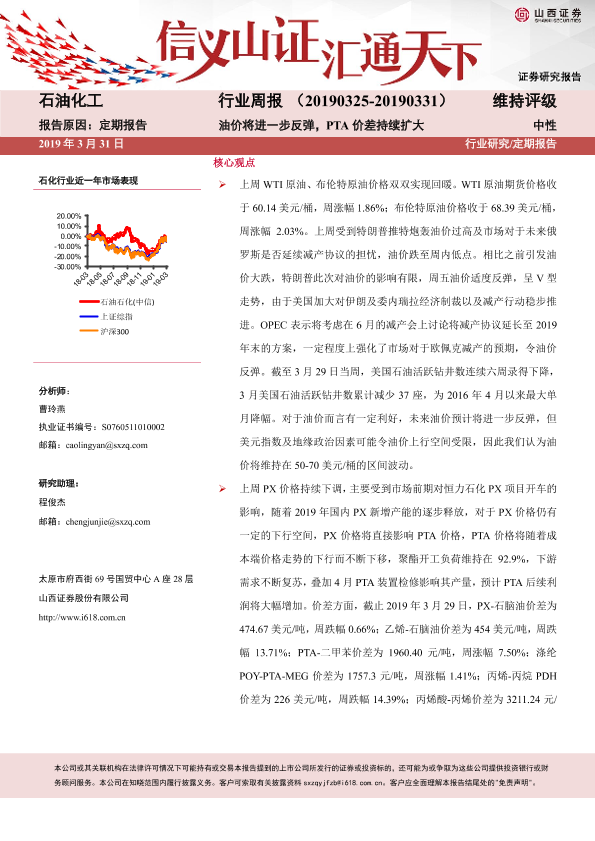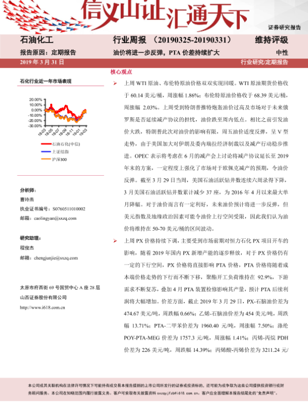 【山西证券】【20190331】20190331-山西证券-石油化工行业周报:油价将进一步反弹,PTA价差持续扩大-13页