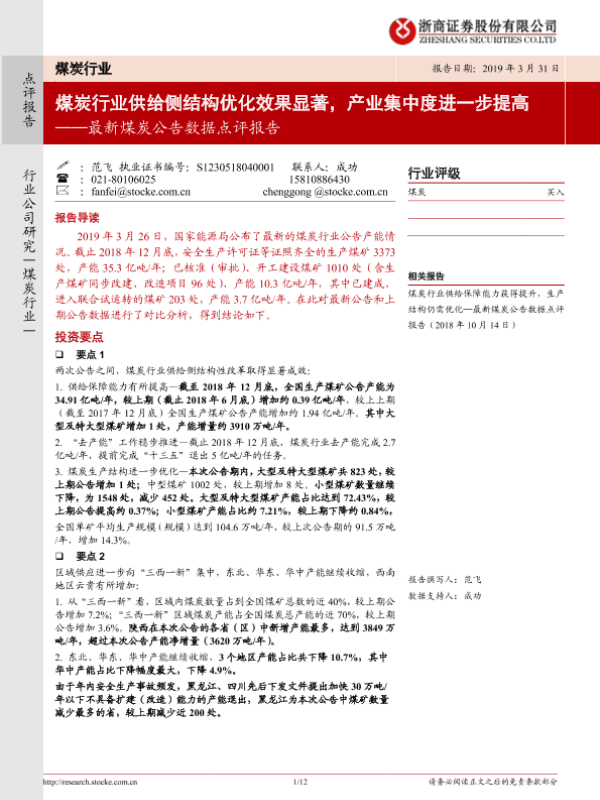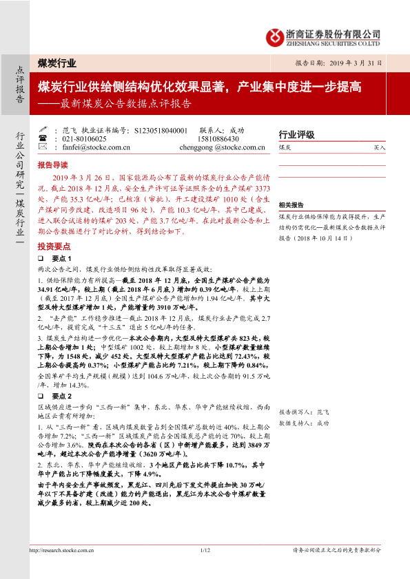 【浙商证券】【20190331】最新煤炭公告数据点评报告:煤炭行业供给侧结构优化效果显著,产业集中度进一步提高-12页