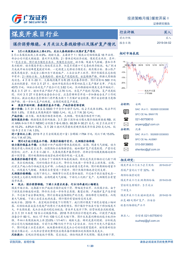 【广发证券】【20190402】20190401-广发证券-煤炭开采Ⅱ行业投资策略月报:煤价弱势维稳,4月关注大秦线检修以及煤矿复产情况-20页