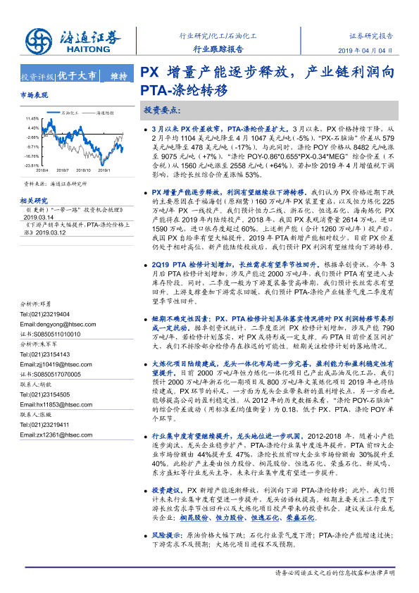 【海通证券】【20190404】20190404-海通证券-石油化工行业跟踪报告:PX增量产能逐步释放,产业链利润向PTA-涤纶转移-4页