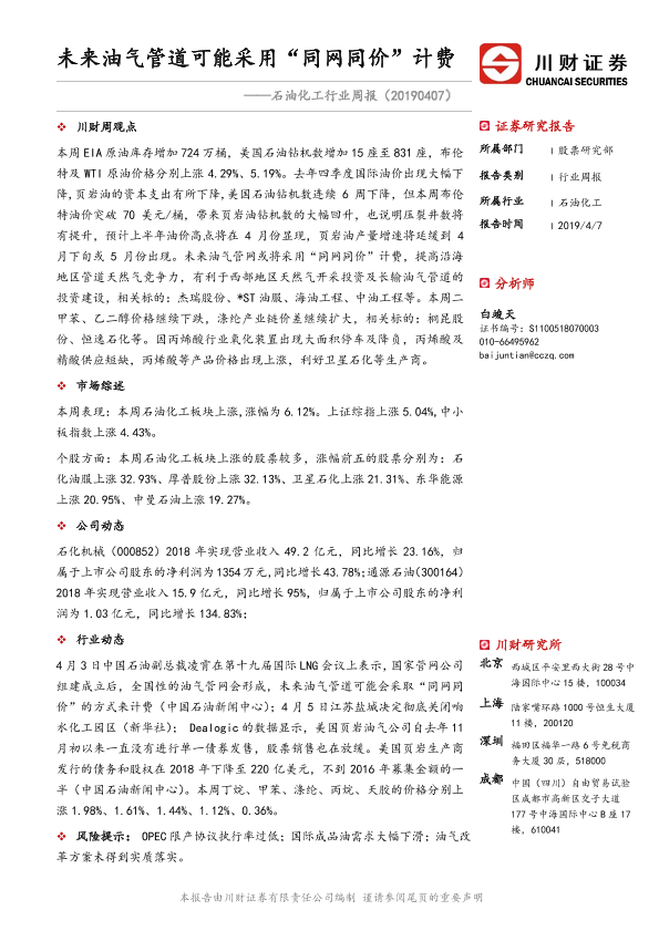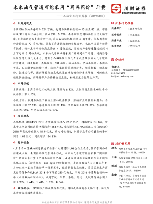 【川财证券】【20190407】20190407-川财证券-石油化工行业周报:未来油气管道可能采用“同网同价”计费-11页
