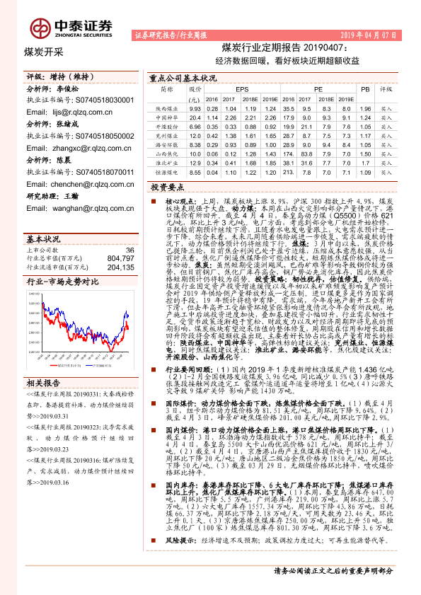 【中泰证券】【20190407】20190407-中泰证券-煤炭行业定期报告:经济数据回暖,看好板块近期超额收益-15页