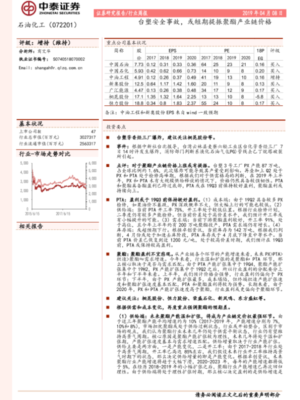 【中泰证券】【20190408】20190408-中泰证券-石油化工行业周报:台塑安全事故,或短期提振聚酯产业链价格-18页