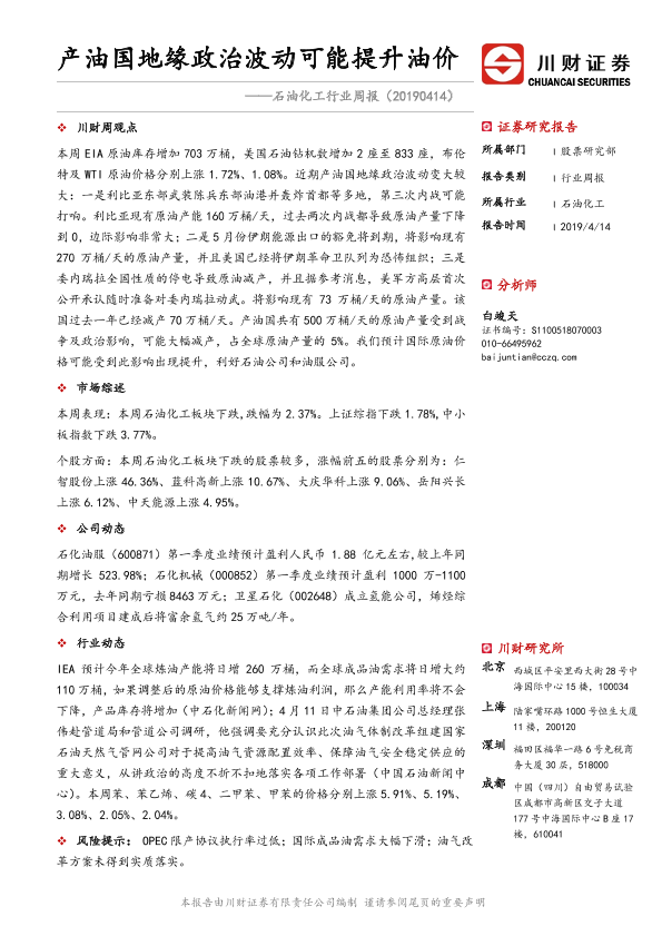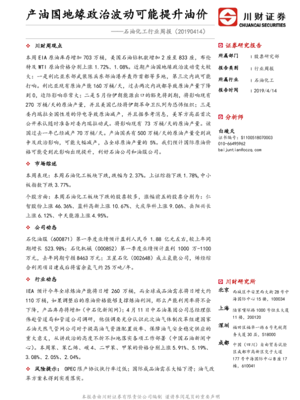 【川财证券】【20190414】石油化工行业周报:产油国地缘政治波动可能提升油价-11页