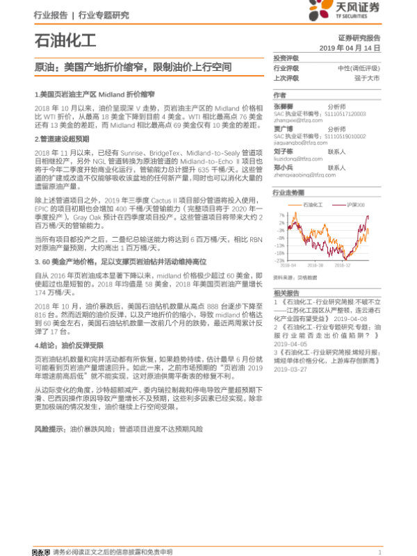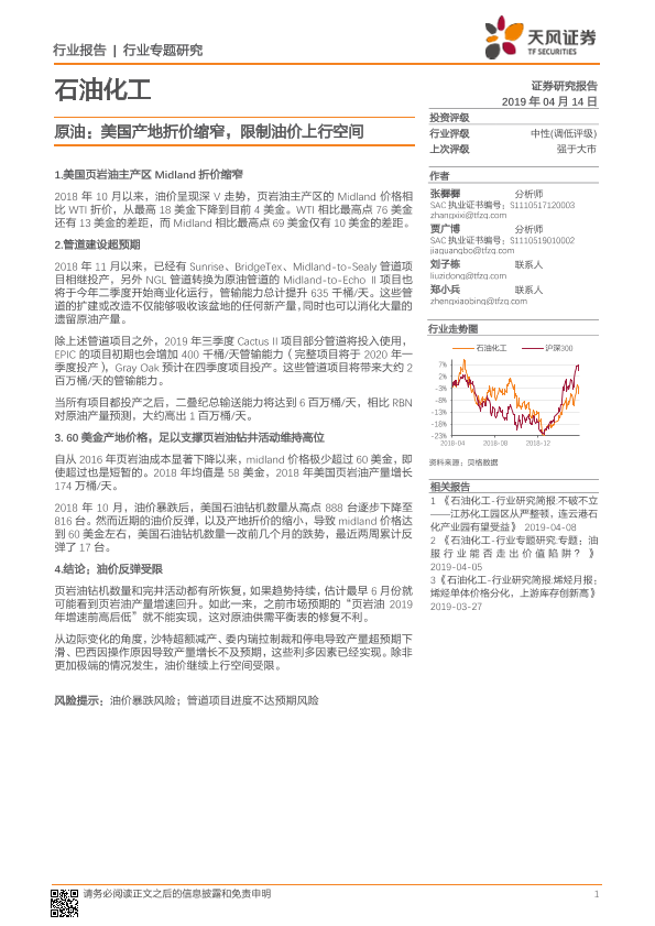 【天风证券】【20190414】石油化工行业专题研究:原油:美国产地折价缩窄,限制油价上行空间-4页