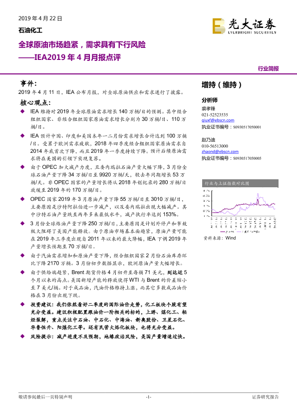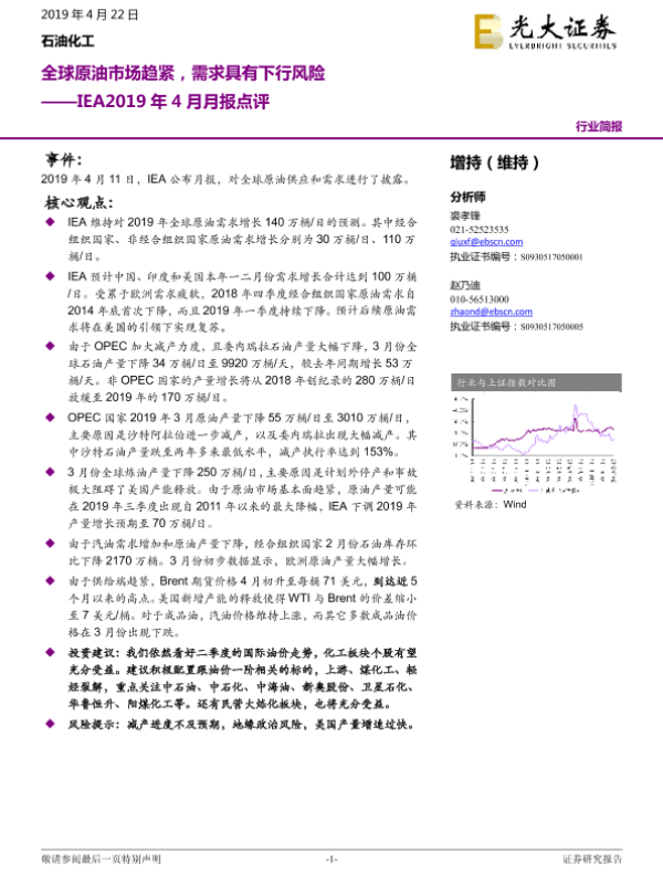 【光大证券】【20190422】IEA2019年4月月报点评:全球原油市场趋紧,需求具有下行风险-4页