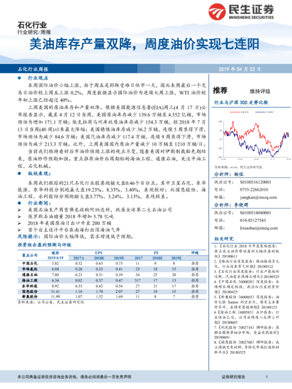 【民生证券】【20190422】20190422-民生证券-石化行业周报:美油库存产量双降,周度油价实现七连阳-15页