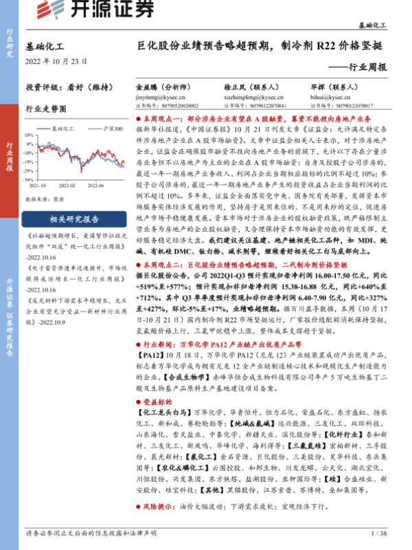 【开源证券】【20221023】化工行业周报:巨化股份业绩预告略超预期,制冷剂R22价格坚挺-38页