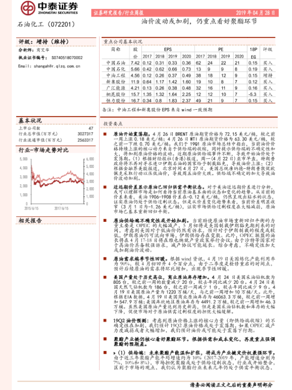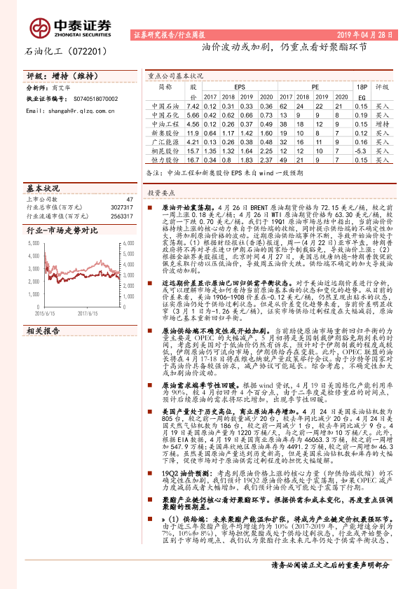 【中泰证券】【20190428】20190428-中泰证券-石油化工行业周报:油价波动或加剧,仍重点看好聚酯环节-19页