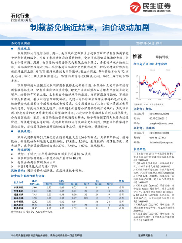 【民生证券】【20190429】石化行业周报:制裁豁免临近结束,油价波动加剧-16页