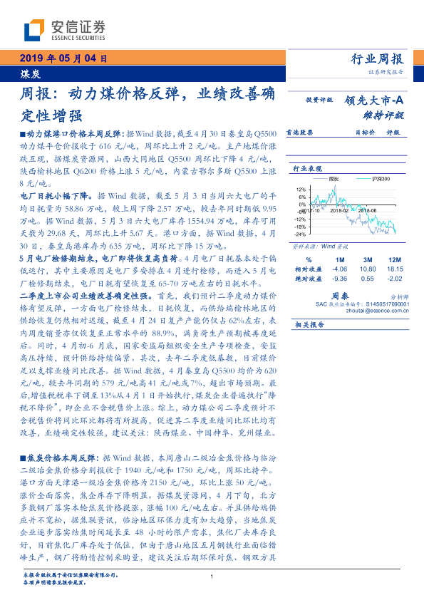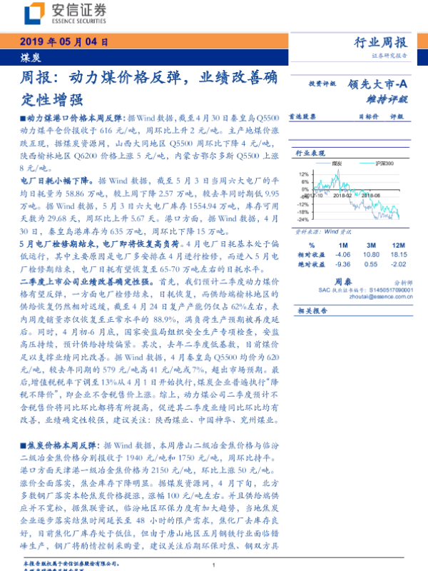 【安信证券】【20190504】20190504-安信证券-煤炭行业周报:动力煤价格反弹,业绩改善确定性增强-22页