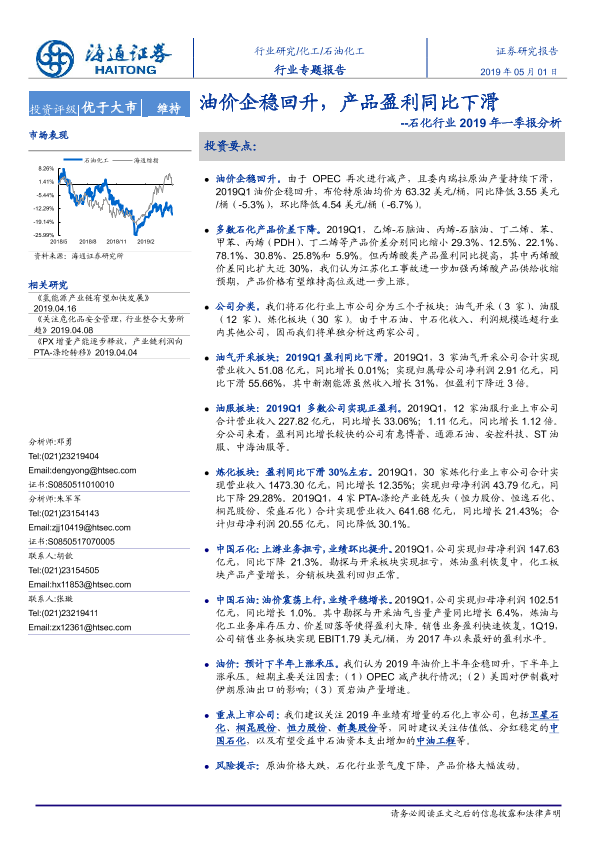 【海通证券】【20190501】石化行业2019年一季报分析:油价企稳回升,产品盈利同比下滑-18页