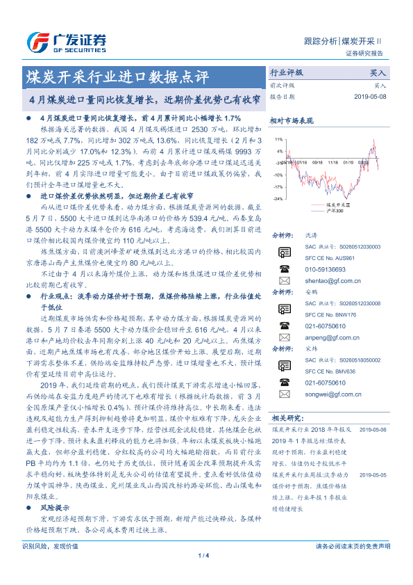 【广发证券】【20190508】4月煤炭进口量同比恢复增长,近期价差优势已有收窄-4页