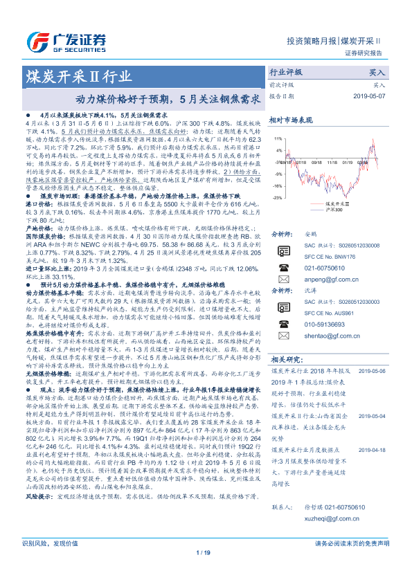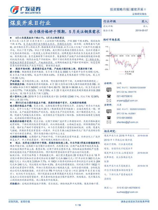 【广发证券】【20190507】煤炭开采Ⅱ行业:动力煤价格好于预期,5月关注钢焦需求-19页