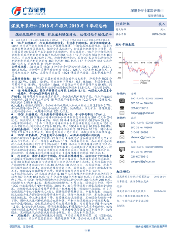 【广发证券】【20190506】煤炭开采行业2018年年报及2019年1季报总结:煤价表现好于预期,行业盈利稳健增长,估值仍处于较低水平-31页