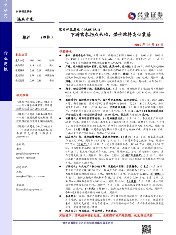 【兴业证券】【20190512】煤炭行业周报(05.05-05.11)——下游需求拐点来临,煤价维持高位震荡-20页
