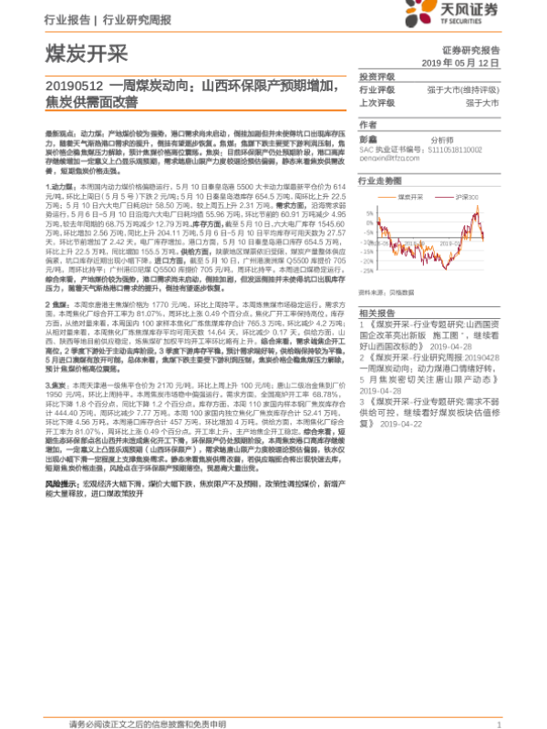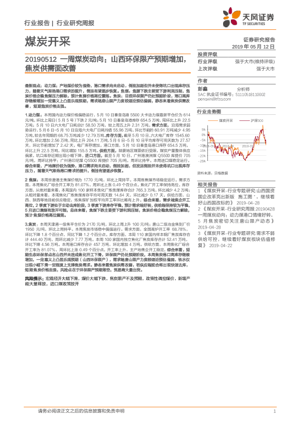 【天风证券】【20190512】20190512-天风证券-一周煤炭动向:山西环保限产预期增加,焦炭供需面改善-19页