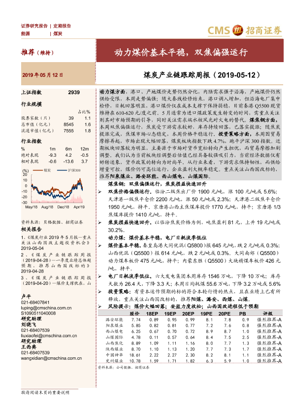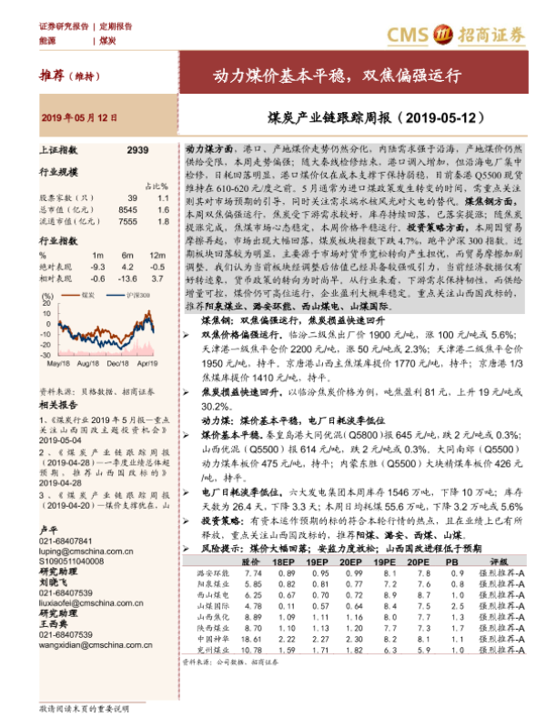 【海通证券】【20190512】煤炭产业链跟踪周报:动力煤价基本平稳,双焦偏强运行-20页