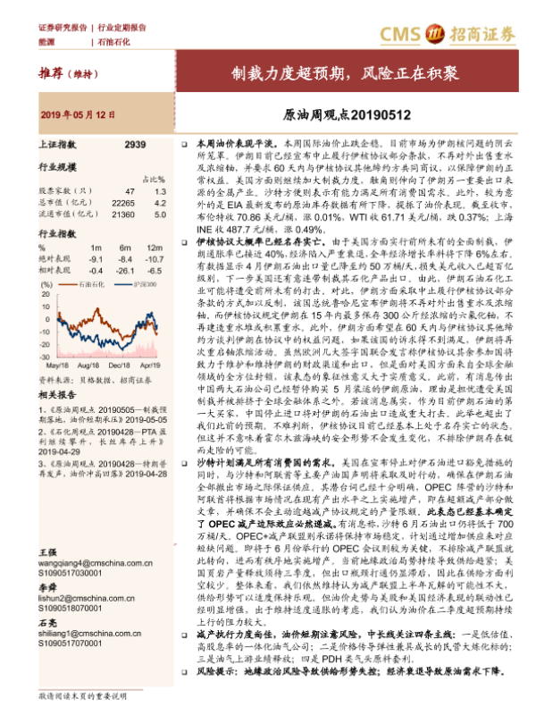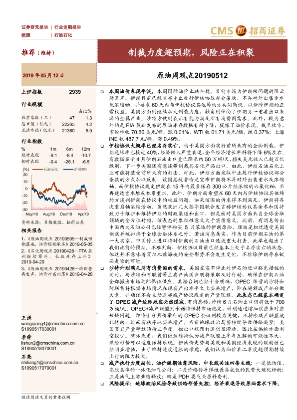 【海通证券】【20190512】原油周观点:制裁力度超预期,风险正在积聚-15页