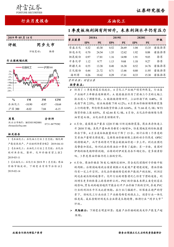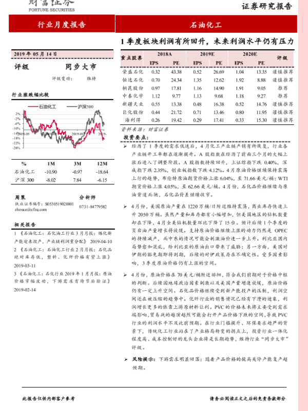 【财信证券】【20190514】石化油工行业月度报告:1季度板块利润有所回升,未来利润水平仍有压力-12页