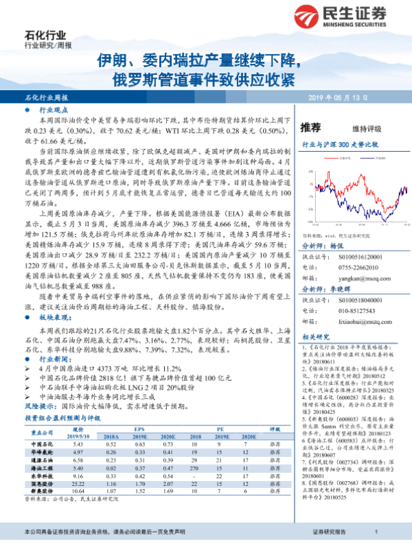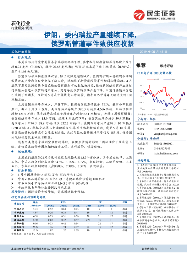 【民生证券】【20190513】20190513-民生证券-石化行业周报:伊朗、委内瑞拉产量继续下降,俄罗斯管道事件致供应收紧-17页