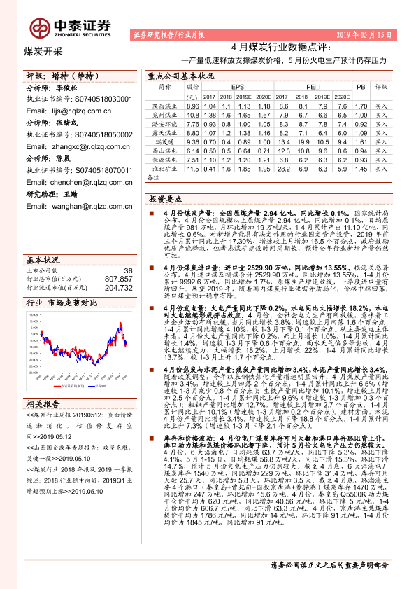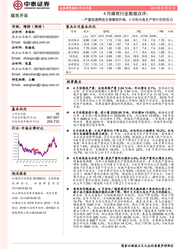【中泰证券】【20190515】4月煤炭行业数据点评:产量低速释放支撑煤炭价格,5月份火电生产预计仍存压力-6页