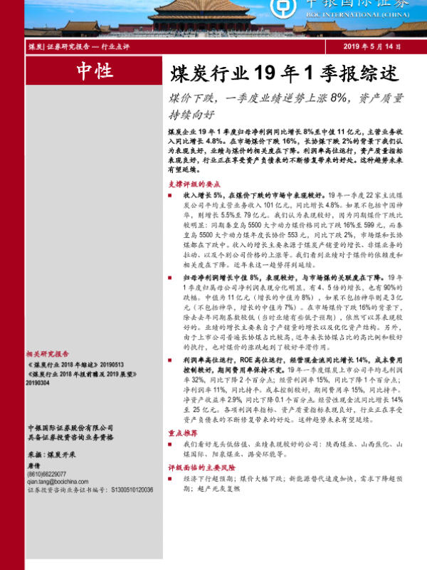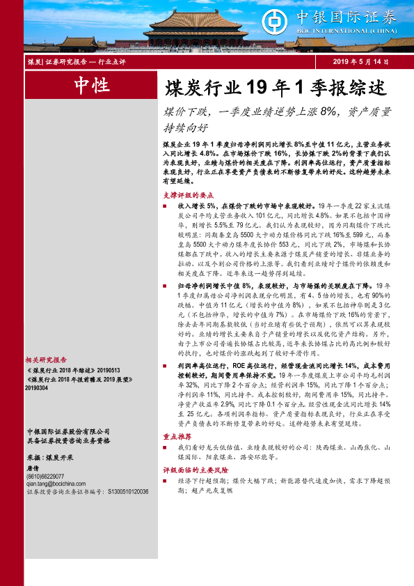 【中银证券】【20190514】煤炭行业19年1季报综述:煤价下跌,一季度业绩逆势上涨8%,资产质量持续向好-11页
