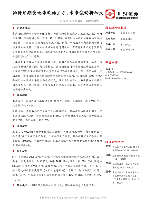 【川财证券】【20190519】石油化工行业周报:油价短期受地缘政治主导,未来波动将加大-12页