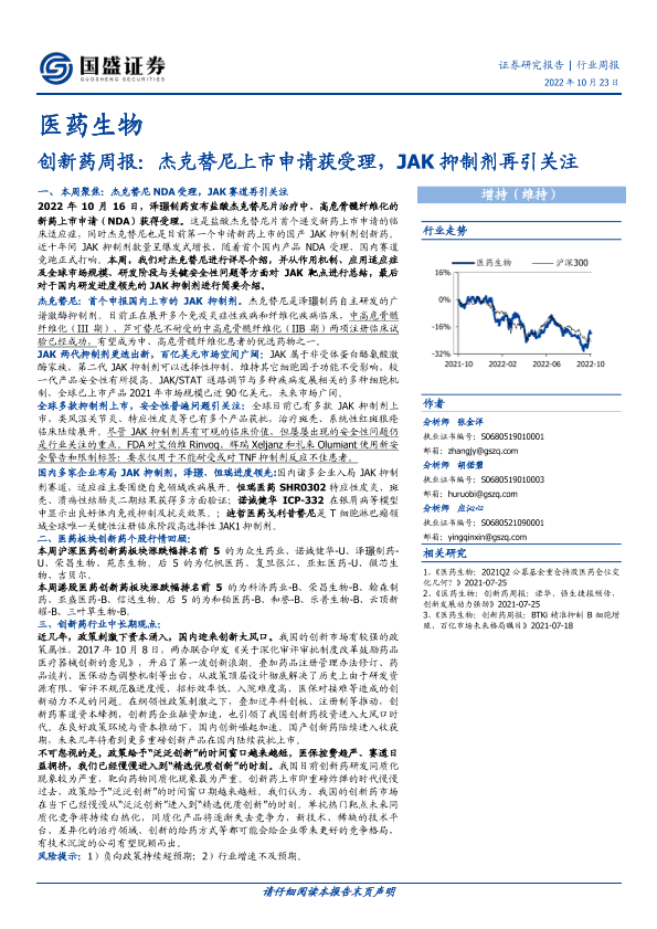 【国盛证券】【20221023】医药生物行业创新药周报:杰克替尼上市申请获受理,JAK抑制剂再引关注-21页