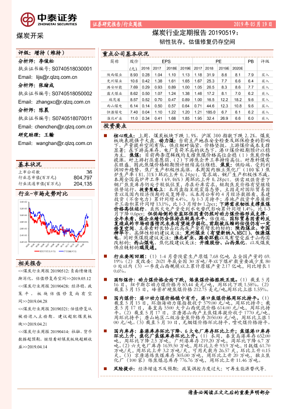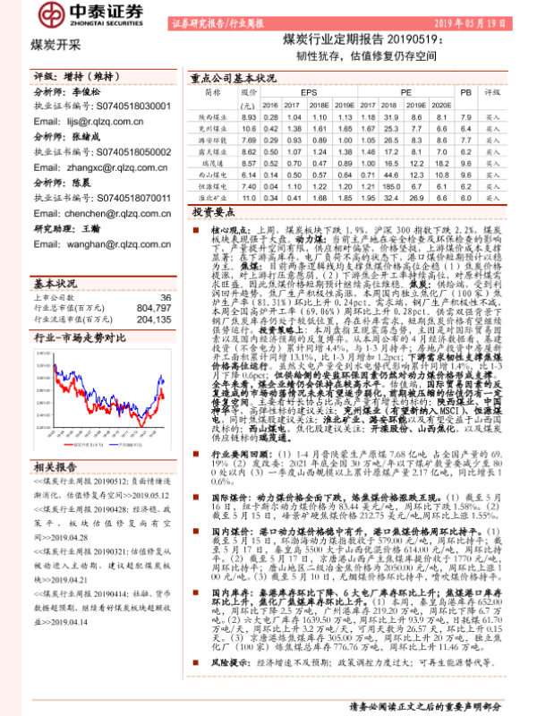 【中泰证券】【20190519】20190519-中泰证券-煤炭行业定期报告:韧性犹存,估值修复仍存空间-15页