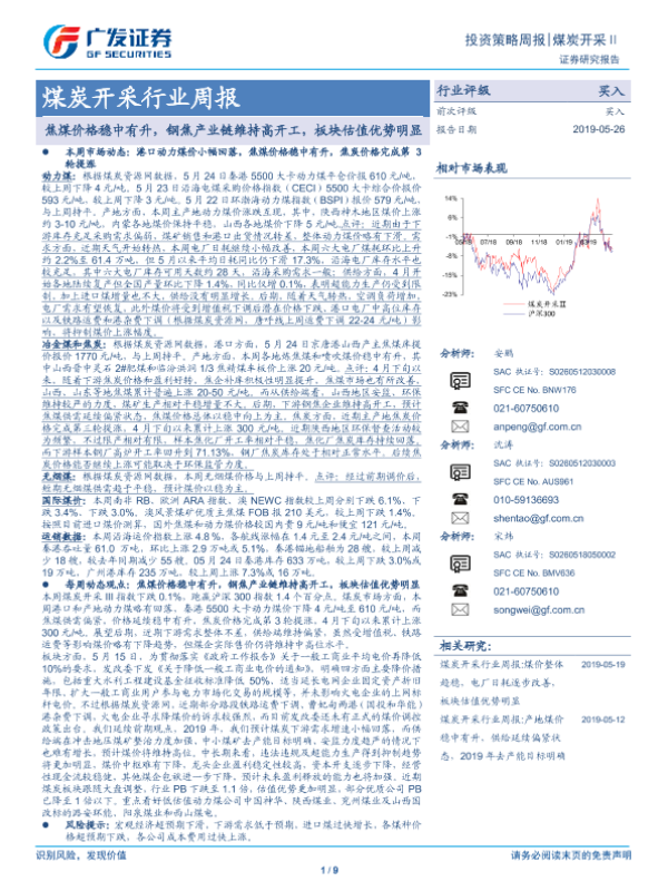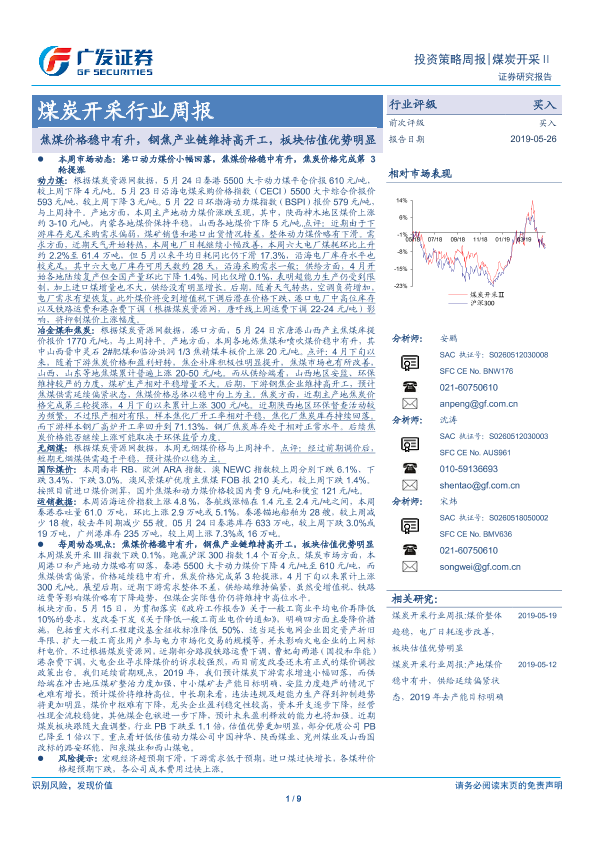 【广发证券】【20190526】20190526-广发证券-煤炭开采行业周报:焦煤价格稳中有升,钢焦产业链维持高开工,板块估值优势明显-9页