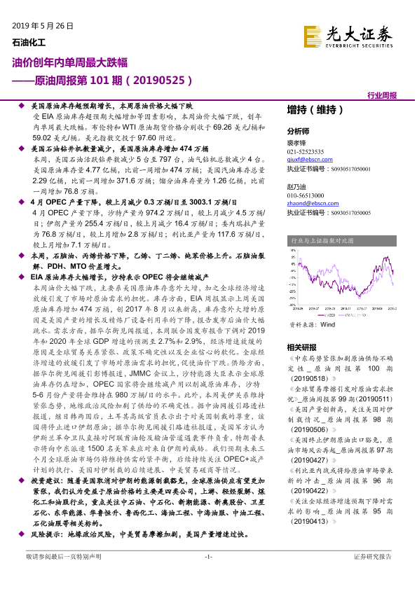 【光大证券】【20190526】原油周报第 101期:油价创年内单周最大跌幅-12页