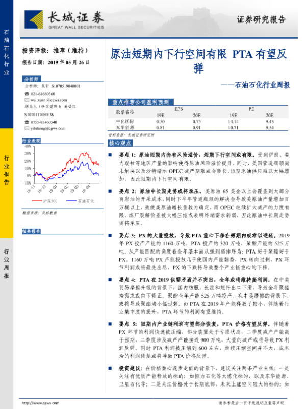【长城证券】【20190526】石油石化行业周报:原油短期内下行空间有限 PTA有望反弹-10页